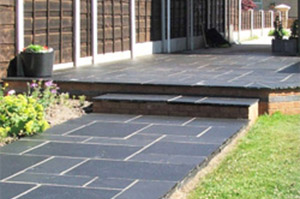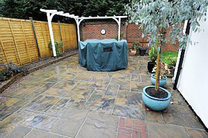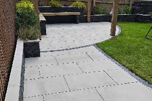 This rear patio terrace and pathways in Aire Drive, Bolton is laid in a random pattern using Grey Indian...