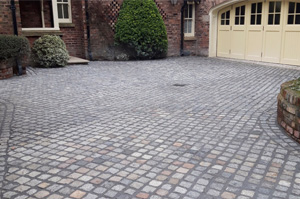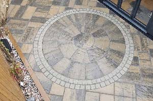 This driveway was designed with concentric circles of Black Limestone and Raj Green Sandstone setts...