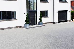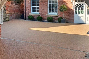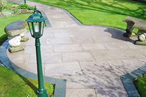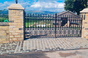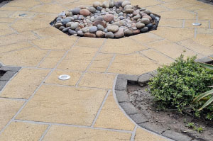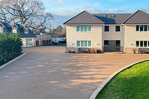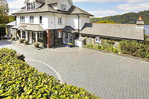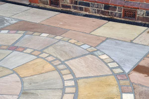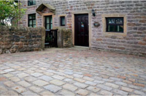 This driveway was designed with concentric circles of Black Limestone and Raj Green Sandstone setts surrounded by Indian Sandstone slabs, with a triple edge band of the same black limestone setts. The paving was all pointed using GftK’s vdw 800; the unique, 2-part, epoxy resin bound sand paving jointing mortars from NCC Streetscape.