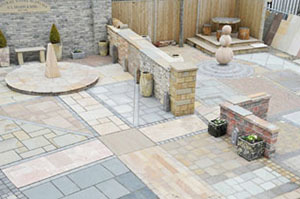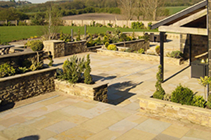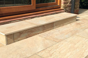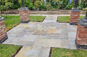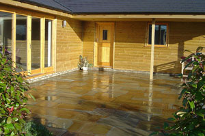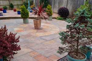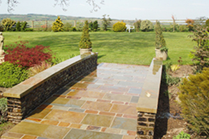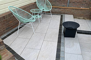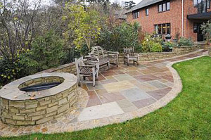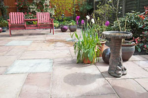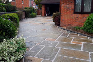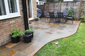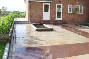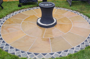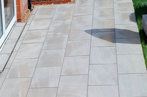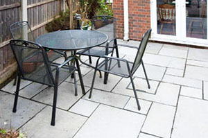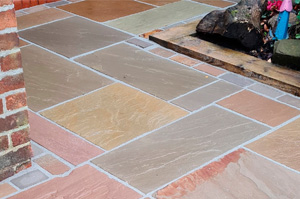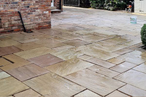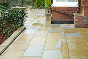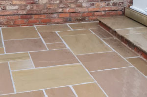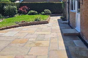 The sawn sandsone paving slabs used to build this patio at a private residence in Warrington,,...