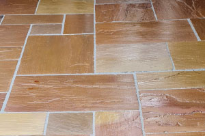 Cleaning the paved surfaces, raking out failed existing cement based paving grout and then repointing by wet-slurry application of GftK's vdw 850+ the unique, 2-part, epoxy resin based, paving joint mortar, to successfully restore, in fact to improve the looks and durability of a sandstone patio.