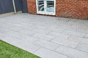 These 600 x 600 mm grey slabs on a new patio in Royston, Hertfordshire had to be finished for a family...