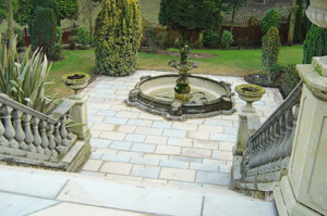 The paving for this large balcony and steps down to another paved terrace area around an...