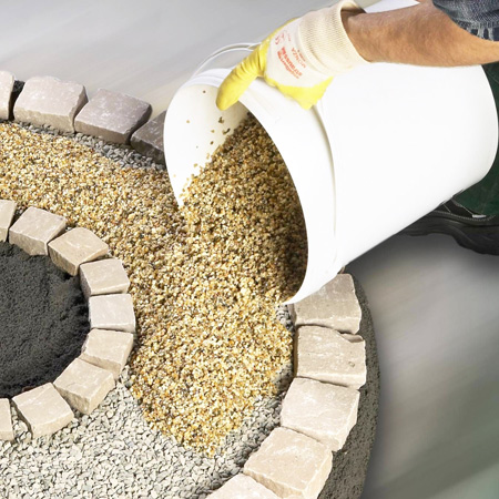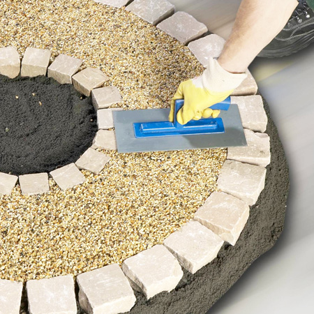 The single component polyurethane resin binder is mixed directly with the kiln-dried aggregate component in a suitable large sized, forced action mixer such as Crete angle, Rota mixer Baron or similar. The mixture is then poured out and laid on the prepared compacted base layer, levelled off and trowel finished. The finished tree pits must be left to cure for a suitable length of time, usually a minimum of 12 hours at 20°C for light foot traffic, and around 7 days before the surfaces can be opened for full service and use.