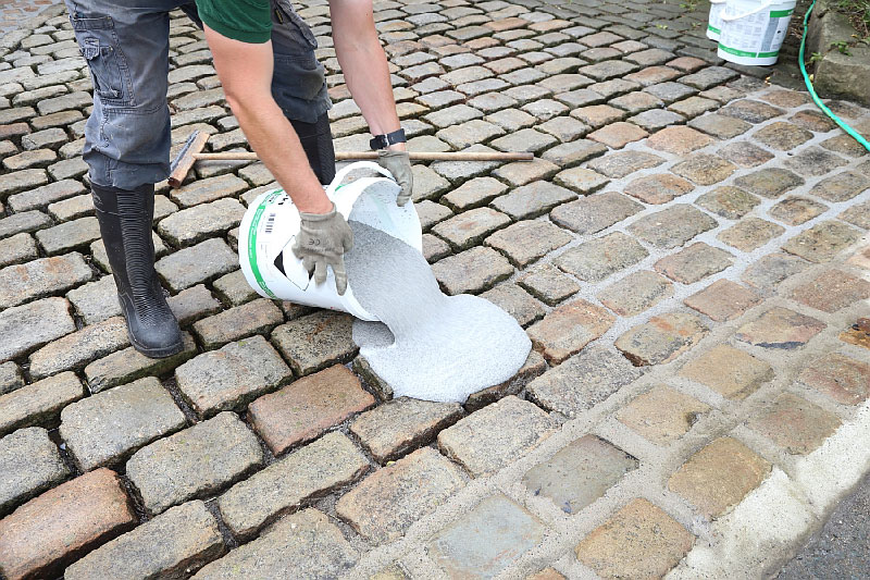 GftK's vdw 850+ Paving Joint Mortar / Grout is designed for extremely fast self-compacting application, with no delays and no additional waiting even during periods of continuously wet weather and at colder temperatures. This is because the material can be applied in the wet, even in the rain - and in cold (non-freezing) conditions, as it will continue to cure and more quickly when the temperature increases again above 8-10 °C.