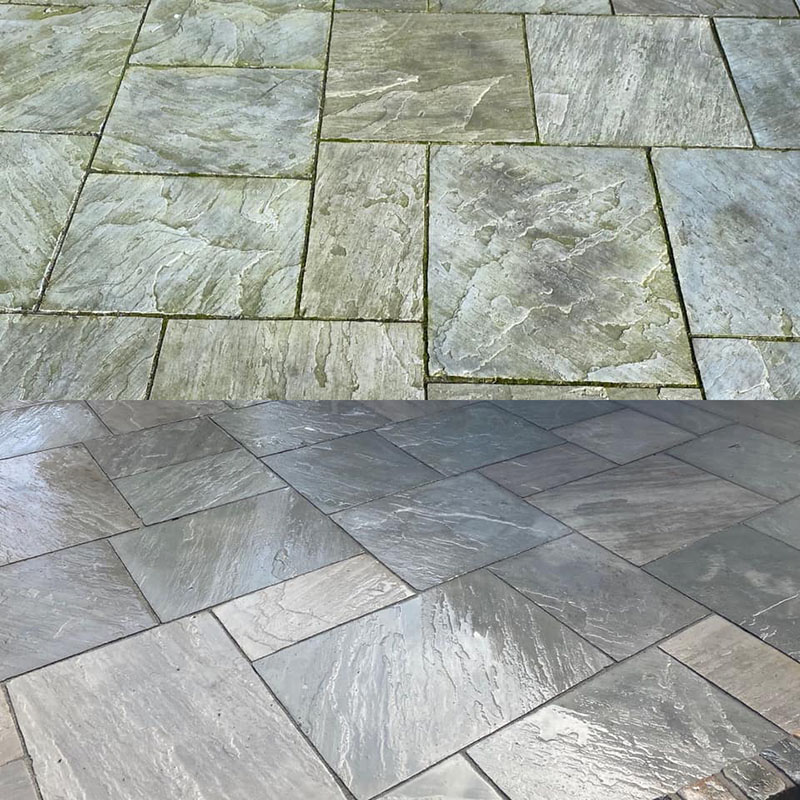 Black Limestone Paving Sealing and Restoration - In recent years there has been a bit of an explosion across the UK in the use of 'natural' Black Limestone paving that is very attractive and works well with many garden designs and like all limestone surfaces is generally reliable and hard wearing. The only issue in fact is that the beautiful black (well very dark grey) paving, only stays black in the ground as the bedrock, that is naturally never exposed to UV light and weathering, and this dark grey, black when wet, very attractive colour only lasts a little longer than the paving installation and grouting period......! Lots of contractors and stone dealers have had a lot of complaints, but this is not really or necessarily their fault, as even limited research will tell you this is the situation. Technically this is as a result of both atmospheric oxidation of black carbon-based pigments in the rock, with simultaneous UV light in the sunlight simuktaneously bleaching the surfaces and so it goes grey. When wetted again by rain or hose, than the underlying black pigment colour in the stone is refracted through the water on and in the surface pores, and so the paving appears to be black again – Magic!