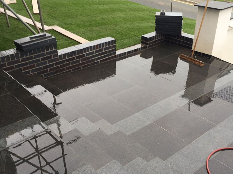 Today many types of natural stone sold for use as paving, is very or very variably porous, especially many sandstones, limestones, and a lot of imported granites. Generally these are hard wearing enough for foot traffic and freeze-thaw attack of the surface is not a big problem in most of the UK, but the main problem is the porosity allows rapid staining from water- and oil-borne materials, from coffee, red wine, cooking oils and general grime, to engine oils etc., plus the surface capillaries make perfect growth cells for green algae and then lichens (blackspot), which is always upsetting when you have paid for lovely attractive paving. This porosity also means that the lovely stone surfaces will attract and take up staining from the cement bedding and especially cement grout, as well as brush-ins and some resin grouts – as well as anything else on site during the construction work. These stains can be a very expensive nightmare to remove and an unnecessary cause of conflict between everyone involved, as they can be an expensive nightmare to remove, and some may require replacing.