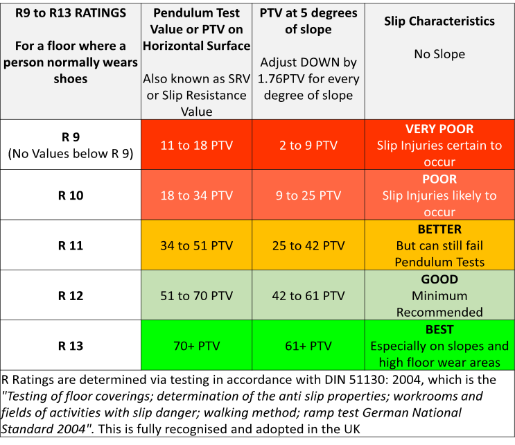 German standards DIN 51130 and stipulate an ‘R rating’. These tests involve a person walking up and down a ramp where the surface is the test floor contaminated with oil whilst the angle of inclination is increased. The results are given in a range (starting for no good reason we know) at Class R9 - Most likely to be slippery, and they go up to Class R13 – the least likely to be slippery - BUT - When the surface is wet and/or contaminated with spillages, and outdoors – Don’t bank on it!