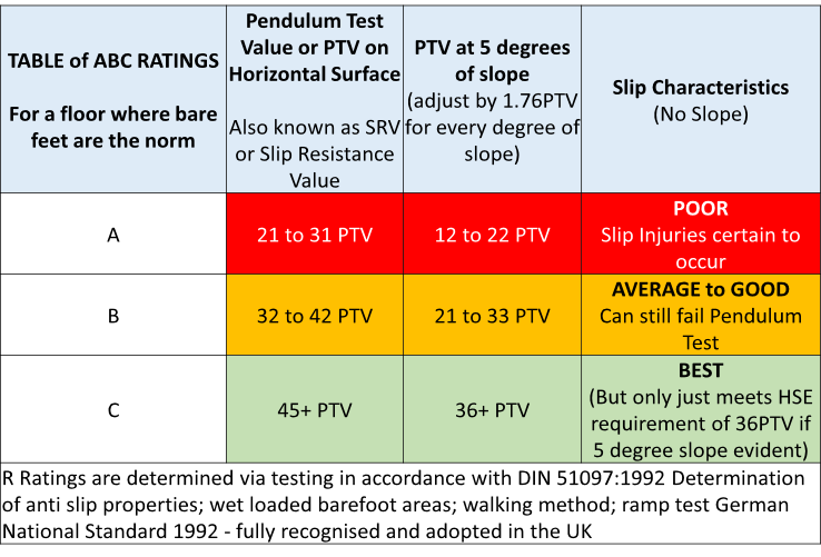 ’ABC’ Ratings for BARE FEET must conform to DIN 51097. ABC Ratings are used for wet floor conditions where bare feet are the norm such as saunas, Jacuzzis, public showers, swimming pools etc.