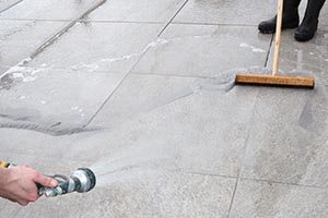 Porcelain paving does not need cleaning e.g. by jet-washing……? Well maybe, BUT ONLY if you keep it pristine clean and treat the porcelain paved surfaces like you do your indoor floors, where you would normally remove and completely clear-up any spillages immediately. Plus, again as you would do indoors, you ensure that the porcelain paved surfaces are swept and mopped clean at least once a week or so, according to use, and that this cleaning regime continues throughout the year, EVERY WEEK of the year and NOT JUST IN SUMMER! – Otherwise, you will find it necessary to jet wash your new porcelain tile paved surfaces regularly, if not frequently, but it will be advisable to do so several times every year as a minimum, to keep it clean and looking good! This will certainly be necessary at the start & end of the season, as well as after any days of heavy use and/or spillages!